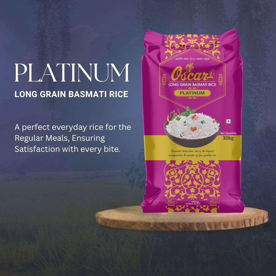 Oscar Platinum Long Grain Basmati Rice. This is the perfect choice for the Regular Meals you rely on, providing a step-up in quality and taste that ensures Satisfaction with every bite.