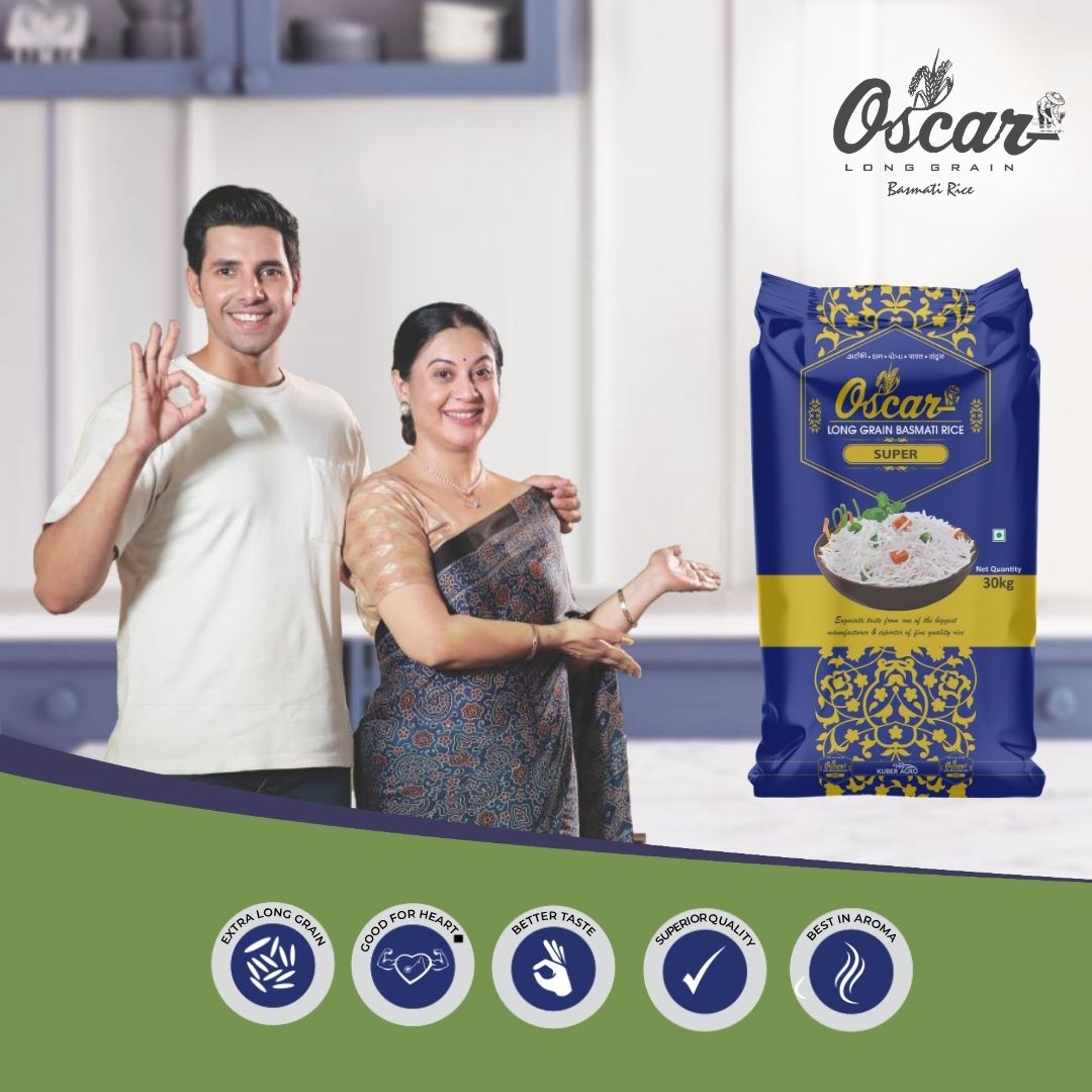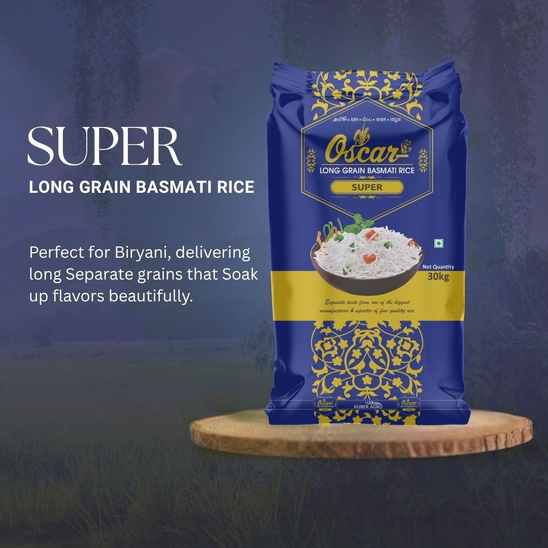 Oscar SUPER Long Grain Basmati Rice. This variant is specifically chosen and milled to be Perfect for Biryani, delivering extra-long, separate, and beautifully fluffy grains that soak up the rich spices and flavors of your dish.