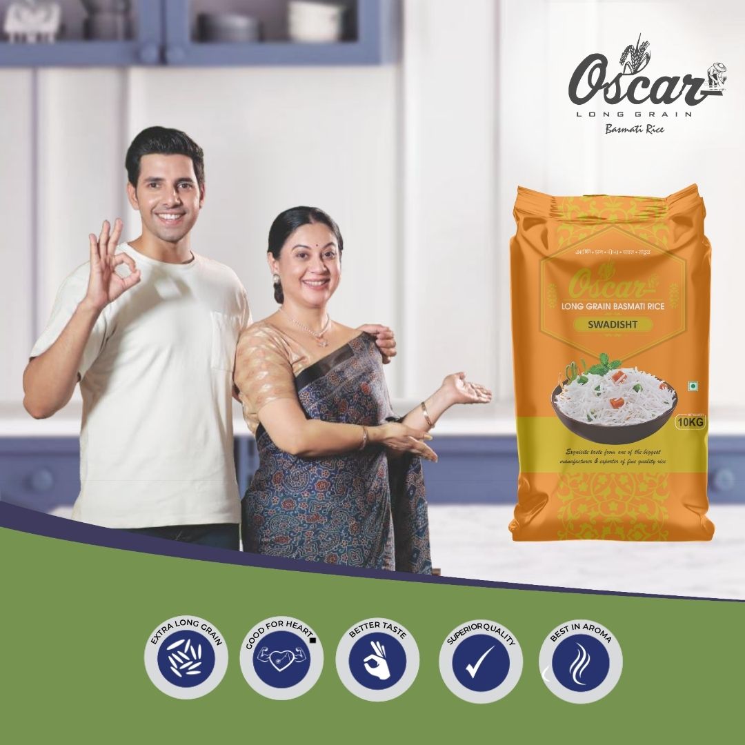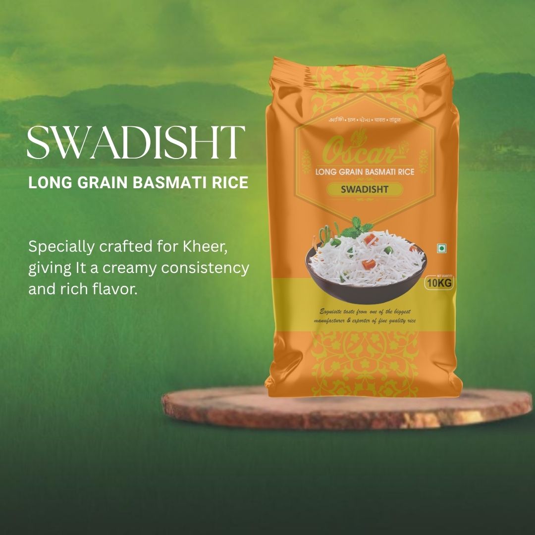 Oscar Swadisht Long Grain Basmati Rice. This unique variety is specially crafted for traditional Indian sweets like Kheer (rice pudding). It possesses a natural property to release the ideal amount of starch during cooking, resulting in a luxuriously creamy consistency and a naturally rich, authentic flavor.