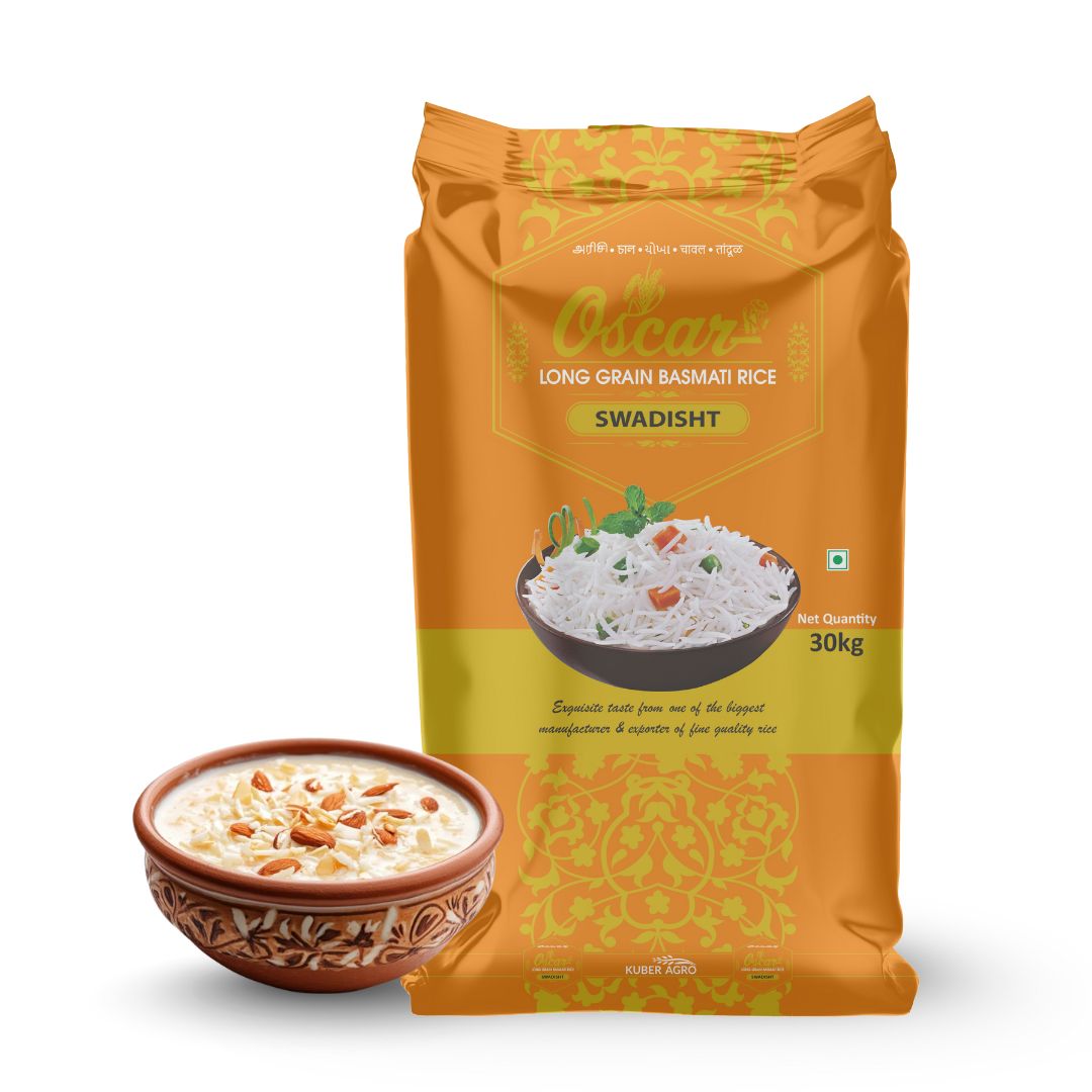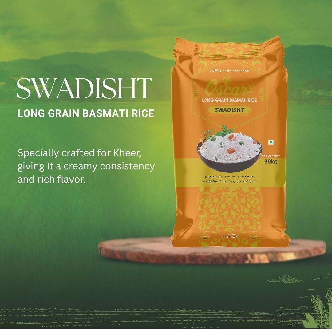 Oscar Swadisht Long Grain Basmati Rice, a unique variety specially crafted for traditional Indian desserts like Kheer (rice pudding). Unlike standard Basmati, Swadisht rice is engineered to break down slightly during cooking, releasing just the right amount of starch to create a luxuriously creamy consistency and a naturally rich, sweet flavor.